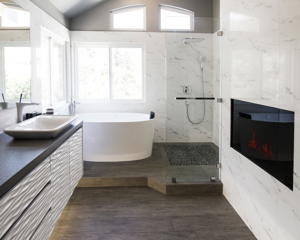 3-D · 3-D texture · 3d · custom · Custom Cabinets · custom-made · Duravit · Fireplace · Hansgrohe · high end · limestone · luxury · natural light · toe kick lighting · victoria + albert · windows · wood